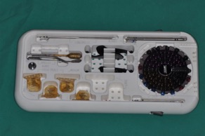 Fig. 2. Trial set includes dummy components, site preparation instruments, and fixation device